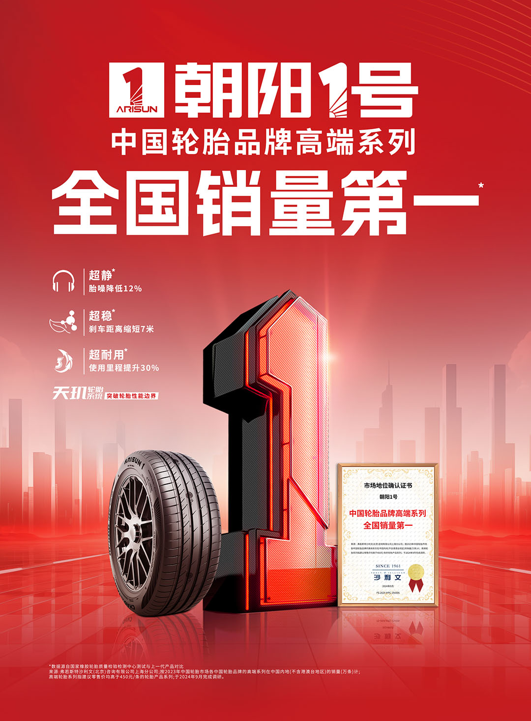 2024年,全球领先的资本市场行业顾问弗若斯特沙利文根据上一年度中国轮胎市场,各中国轮胎品牌的高端系列在中国内地(不含港澳台)的销量做出的一项行业调研显示,朝阳1号成为中国轮胎品牌高端系列全国销量第一,彰显了1号轮胎在中国高端轮胎上的引领地位。